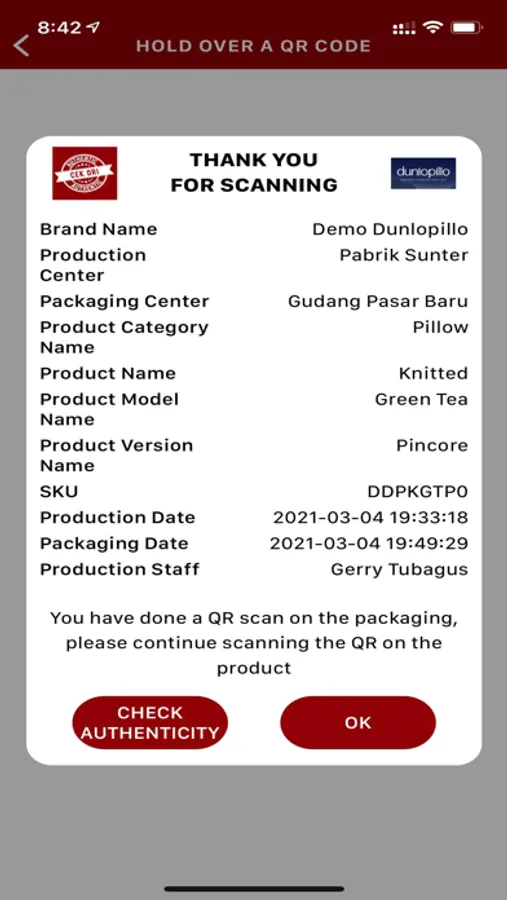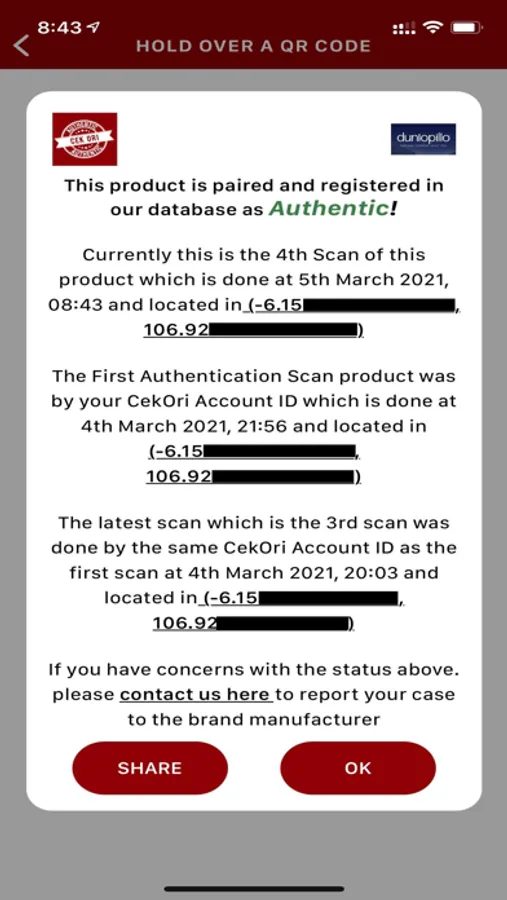 All you have to do is scan the two QR codes and in a few seconds, all 2 scans are uniquely recorded for time, location and who scans it. Privacy and access permissions are used for the sole purpose of authenticity of the particular product. Time and location information are only accessed during QR code scanning process. CekOri never keeps trace of a user’s whereabouts outside of the function of CekOri’s authentication to protect user’s privacy.