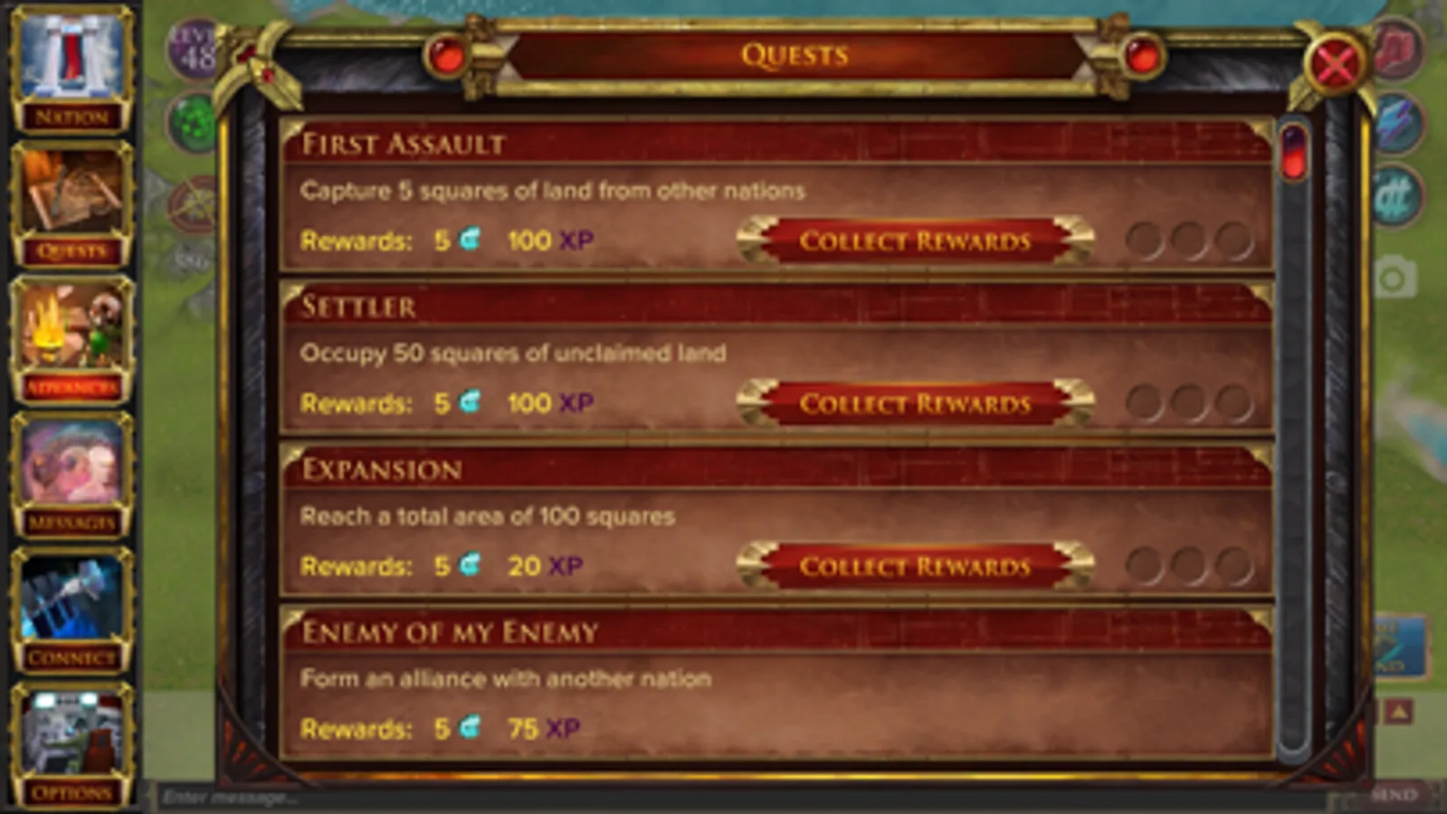 To attack and defend you’ll need to keep up healthy supplies of the game’s two main resources, manpower and energy. How quickly you generate these resources depends on the advances you’ve developed, and whether you’ve captured special map locations such as Fresh Water, Geothermal Vents and many more. How rapidly you generate the energy needed to sustain defenses also depends on your nation’s ‘geographic efficiency’, a measure of how well consolidated your nation’s territories are. This means you’ll need to balance expanding your nation against spreading yourself too thin.