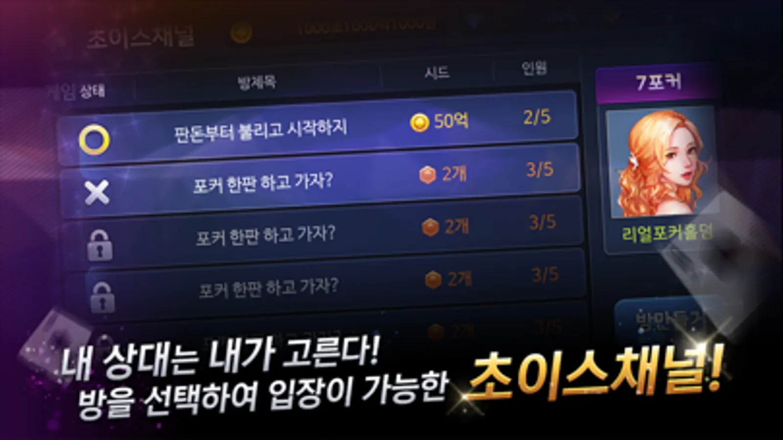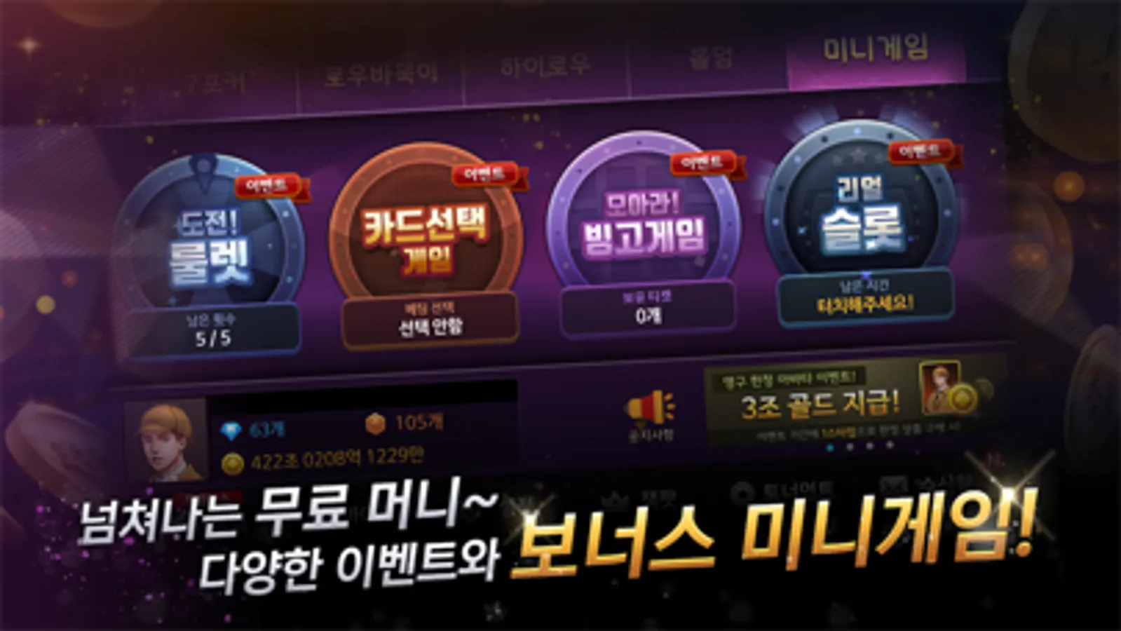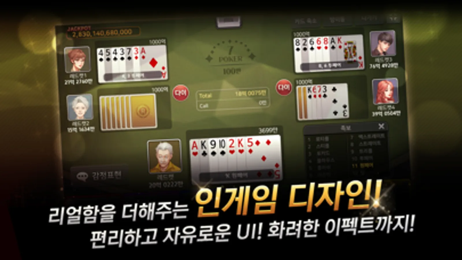 세븐 포커, 로우 바둑이, 하이로우는 기본~ 짜릿한 한방이 있는 홀덤까지! 리얼함이 다른 무료 포커 게임을 바로 경험해보세요!