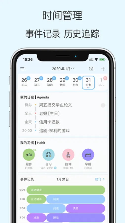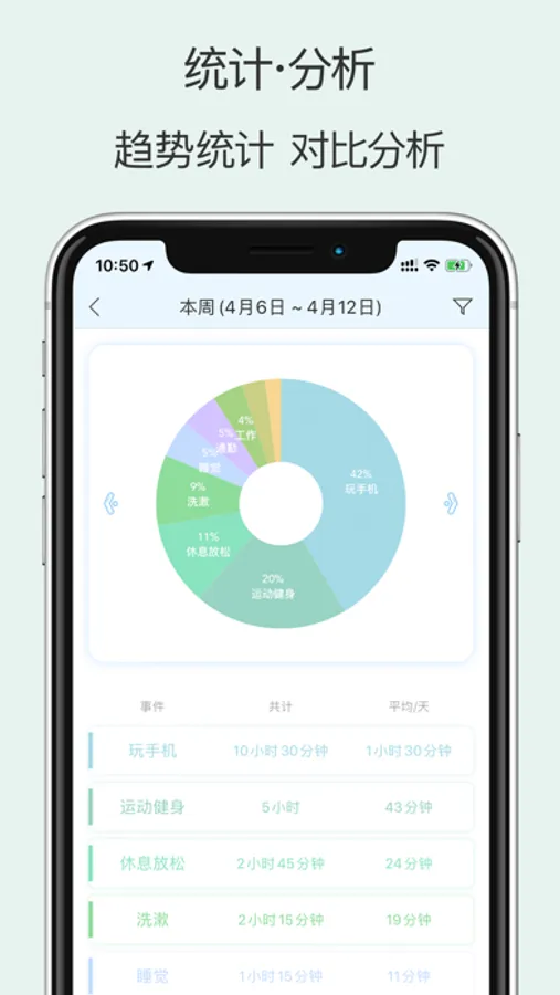 通过不断的记录,得到每周、每月、每年的记录统计结果,利用这些数据您能够方便地对自己的时间利用情况进行监控和管理,不断地调整,遇见更好的自己!