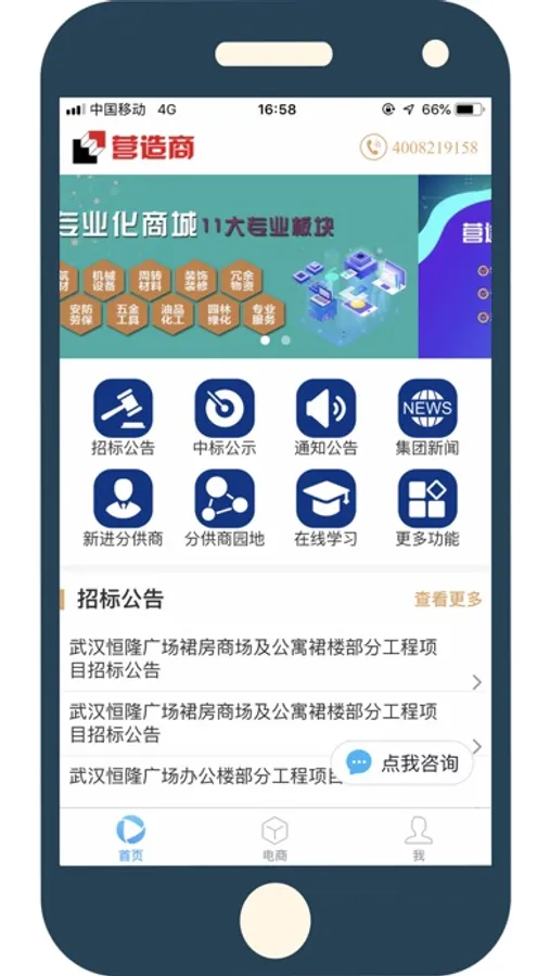 营造商移动应用端作为上海建工电商平台的辅助工具,摆脱了固定网络及PC端操作的限制,可随时随地方便的对招投标项目过程进行查看、审批,大大提高了工作效率。