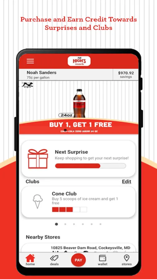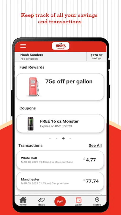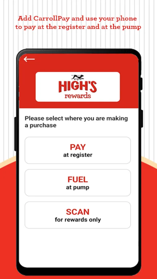 The High’s Rewards program is a free rewards program that helps you save money on fuel and convenience store items across all High’s Stores. Join High’s Rewards to receive surprises, club programs, and offers that match your preferences. You can earn additional fuel savings when you register for Carroll Pay and also pay with your phone at the gas pump or inside.