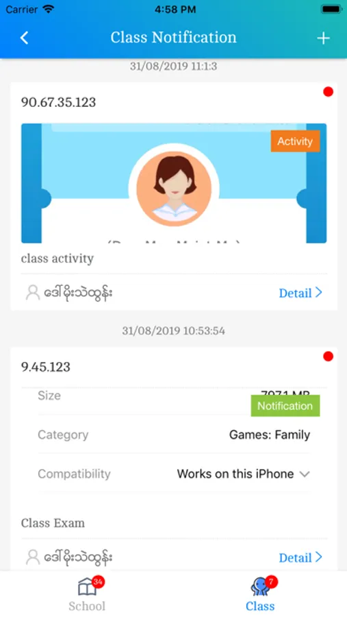 8. Through " Notification" module, teacher could real-time send class notification and check parents comments, parents could real-time get class notification.