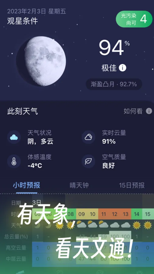 今日天文气象条件预报功能,利用了公开的气象信息,基于地理位置与月亮升落等信息,对天文观测条件进行预报,能通过可感知的数据让用户了解天文观测条件。