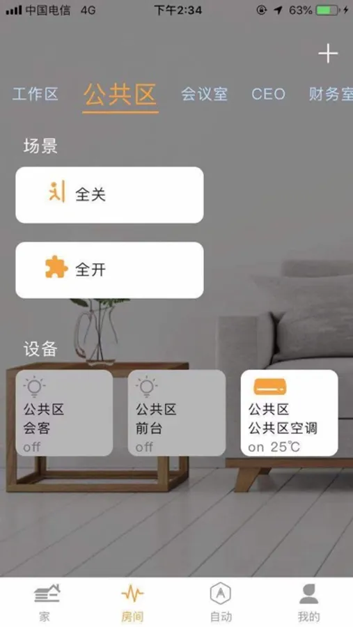 【联动控制】PM2.5传感器实时采集室内空气PM2.5值,当数值超出某一个范围时,可以联动空调,开启除PM2.5功能,保证室内空气的清晰。