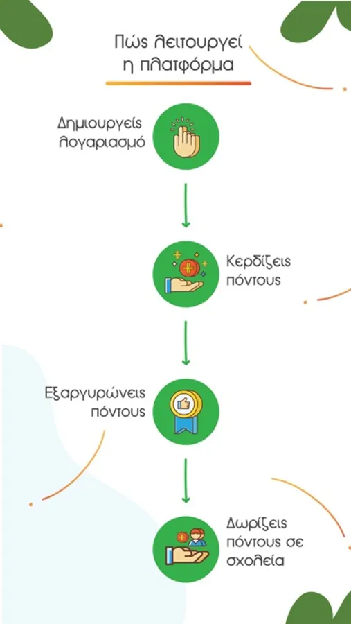 • Οι πολίτες δημιουργούν λογαριασμό και κερδίζουν πόντους μέσω online εκπαιδευτικών δράσεων για την ανακύκλωση (όπως άρθρα, βίντεο ή κουίζ) και μέσω καταχώρησης της ανακύκλωσης που κάνουν στον δήμο τους.