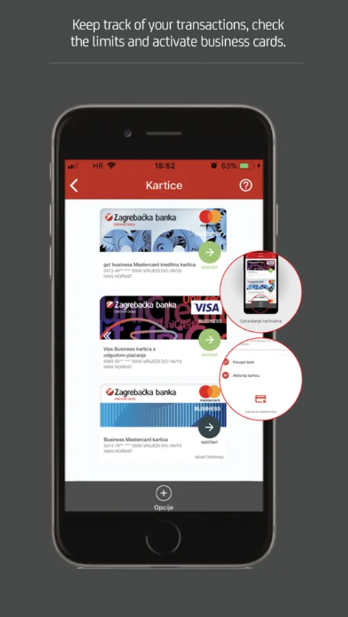 - aktivirati poslovne kartice, pregledati transakcije i dohvatiti PIN,