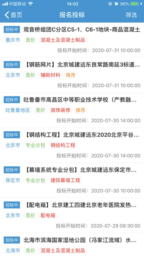 3、精准搜索 兰格集采APP实现按照关键字、采购类型、地区、项目类型等快速精准查询。