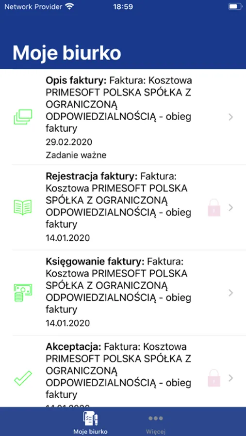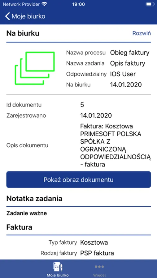 • możliwość wykonania zdefiniowanych zadań w ramach danego procesu, między innymi akceptacja i przekazanie dokumentu, odrzucenie dokumentu