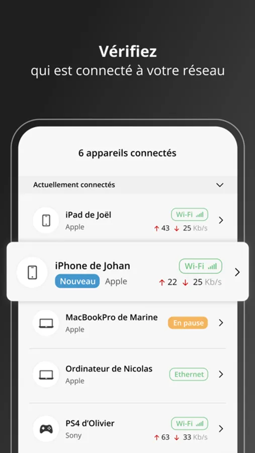 Soyez sûr qu'il n’y a pas d’intrus sur votre réseau en inspectant les appareils connectés. Vous savez aussi qui vous ralenti grâce aux débits consommés par les appareils connectés.