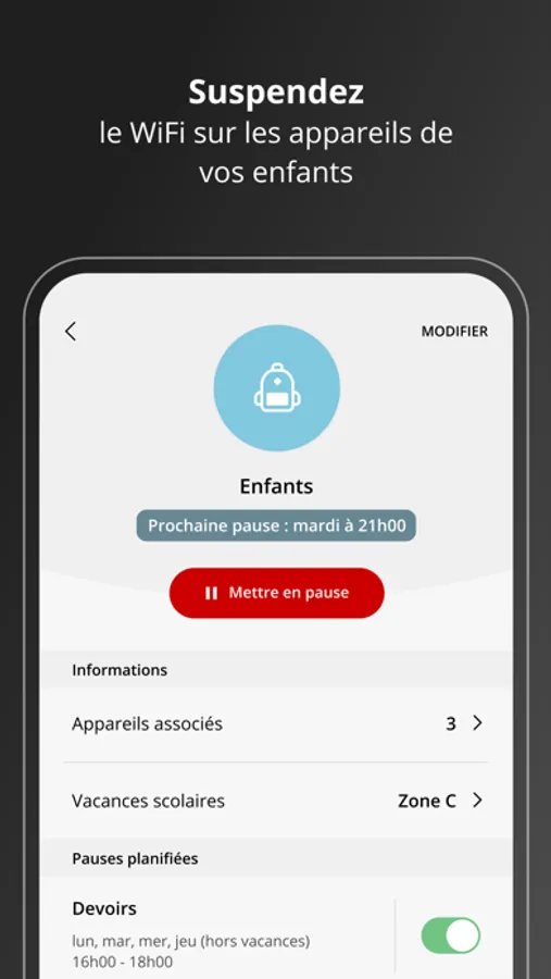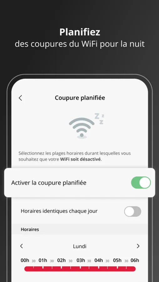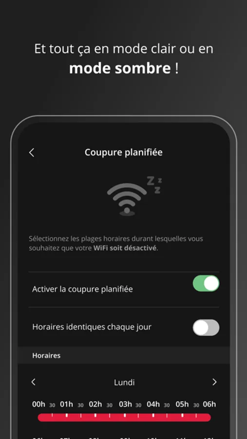 Gardez l’esprit tranquille en désactivant automatiquement le WiFi la nuit. Et si vous vous réveillez plus tôt que prévu, vous le réactivez en un clic.