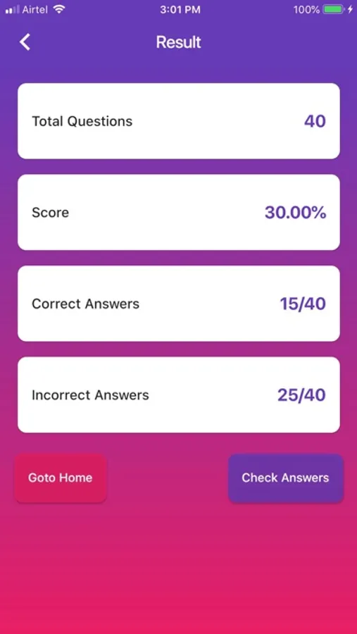 - End of the test display result of all questions. So user can verify his true answer and wrong answer.