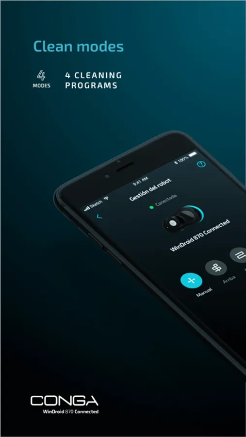 Application compatible with Conga WinDroid 870 Connected model. Allows you to control the different cleaning modes of the glass-cleaning robot. Also, control the robot's on and off.