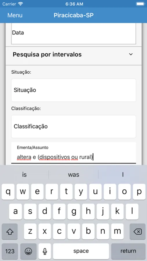 O campo Ementa/Assunto também pode ser usado palavras no plural ou singular, com ou sem acentuação. Para uma pesquisa avançada mais abrangente pode-se usar aspas duplas e conectores como e, ou, não, +, -, ().