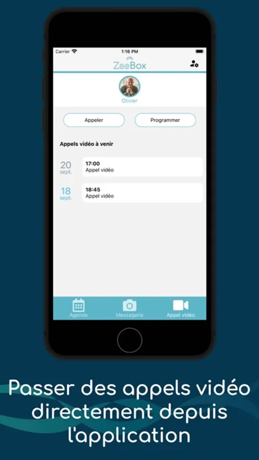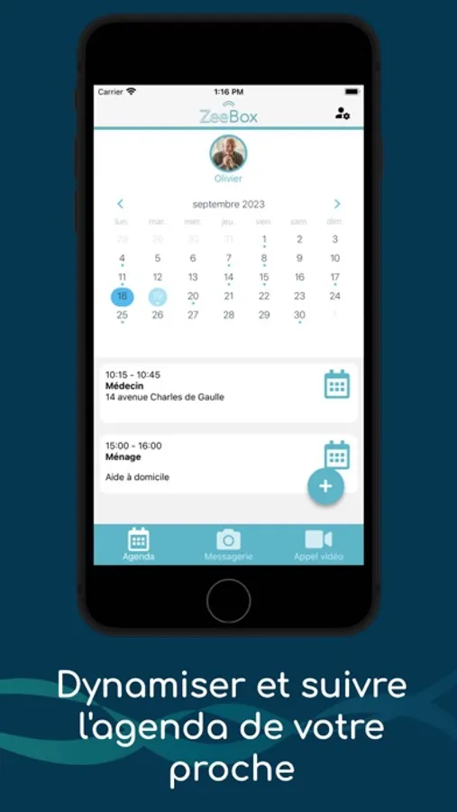 Le service agenda quant-à-lui offre à l’aidant une vision complète des rendez-vous enregistrés sur la Zeebox de l’utilisateur. Celui-ci peut également y ajouter des rendez-vous directement depuis l’application qui seront alors envoyés instantanément à la Zeebox et ainsi rappelés sur la télévision.