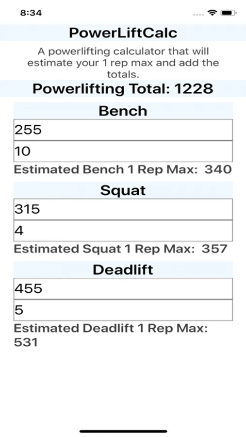 Estimate your powerlifting total. Enter your top reps and weights for squat, bench, and deadlift to get a total powerlifting score.