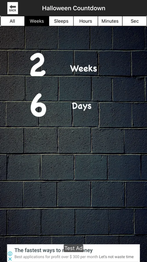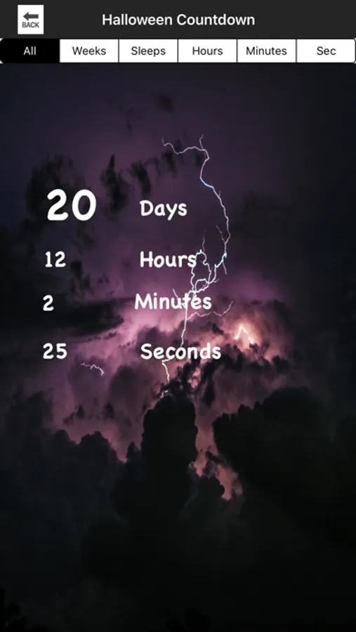 There are Multiple Time Modes including counting down the number of total weeks, nights, hours, minutes or even total seconds until Halloween.