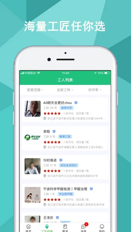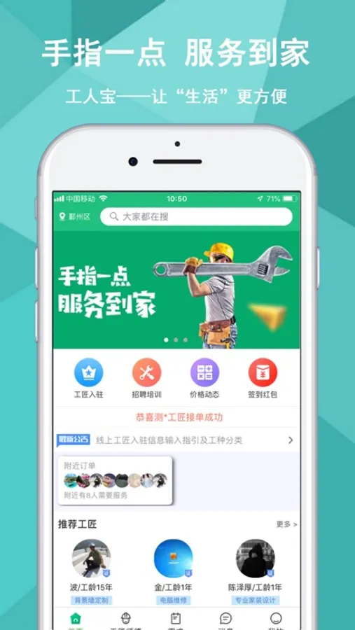 工人宝旨在为所有能工巧匠建立一个发挥技能,锤炼匠心的共享服务平台,通过工匠精神的传承和发扬,为用户带去不一样的产品和体验!用户通过平台一键发布需求也能精准获得专业工匠,即时满足用工所需,并获得省时、省心、省力的服务体验!
