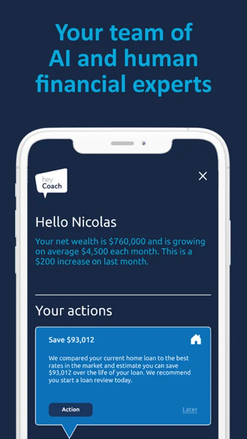 Unlock your team of financial experts. Hey Coach is the trusted, secure money app that combines smart AI and human expertise to improve your financial position. More than a budgeting app, we connect all your finances in one place. Inside the app you will find property, investments, super, budgeting, vehicles, credit cards, loans, goals, projections and so much more.