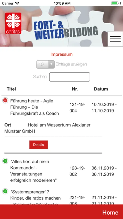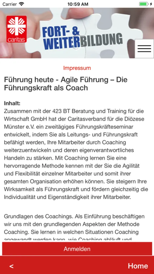 Der DiCV Münster bietet verschiedene Fortbildungen an, um die fachlichen, persönlichen und sozialen Kompetenzen der Mitarbeiter anzusprechen und diese für neue Anforderungen weiterzuentwickeln. Durch die Fortbildungsapp erhalten unsere Mitglieder einen leichten Zugang zu den passenden Fortbildungen. Es ist künftig nicht mehr erforderlich umfangreiche Programmkataloge zu studieren: Ab jetzt kann man auch unterwegs, jederzeit und komfortabel nach dem idealen Angebot suchen, sich über alle Details informieren und sich direkt online anmelden.