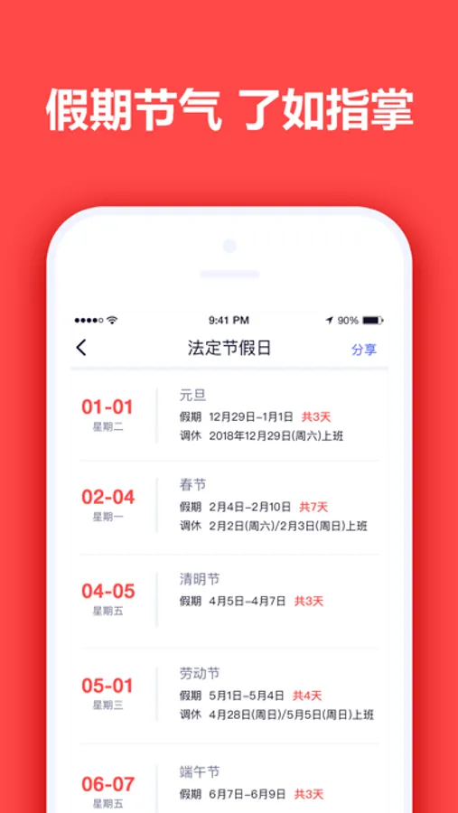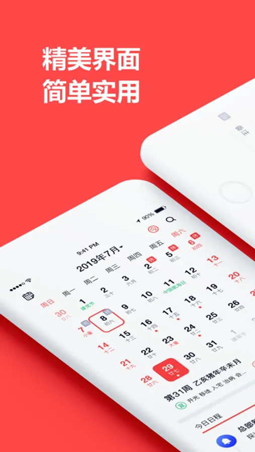 农历、黄历、提醒、日记、节日、放假安排等,简单实用,占用内存极小,适合中国人的日历。高效管理时间,从容应对每一天。
