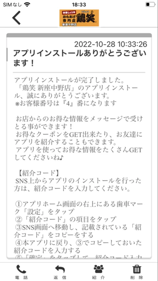鶏笑 新座店のアプリをSNSを通じてお友達に紹介する事ができます。
