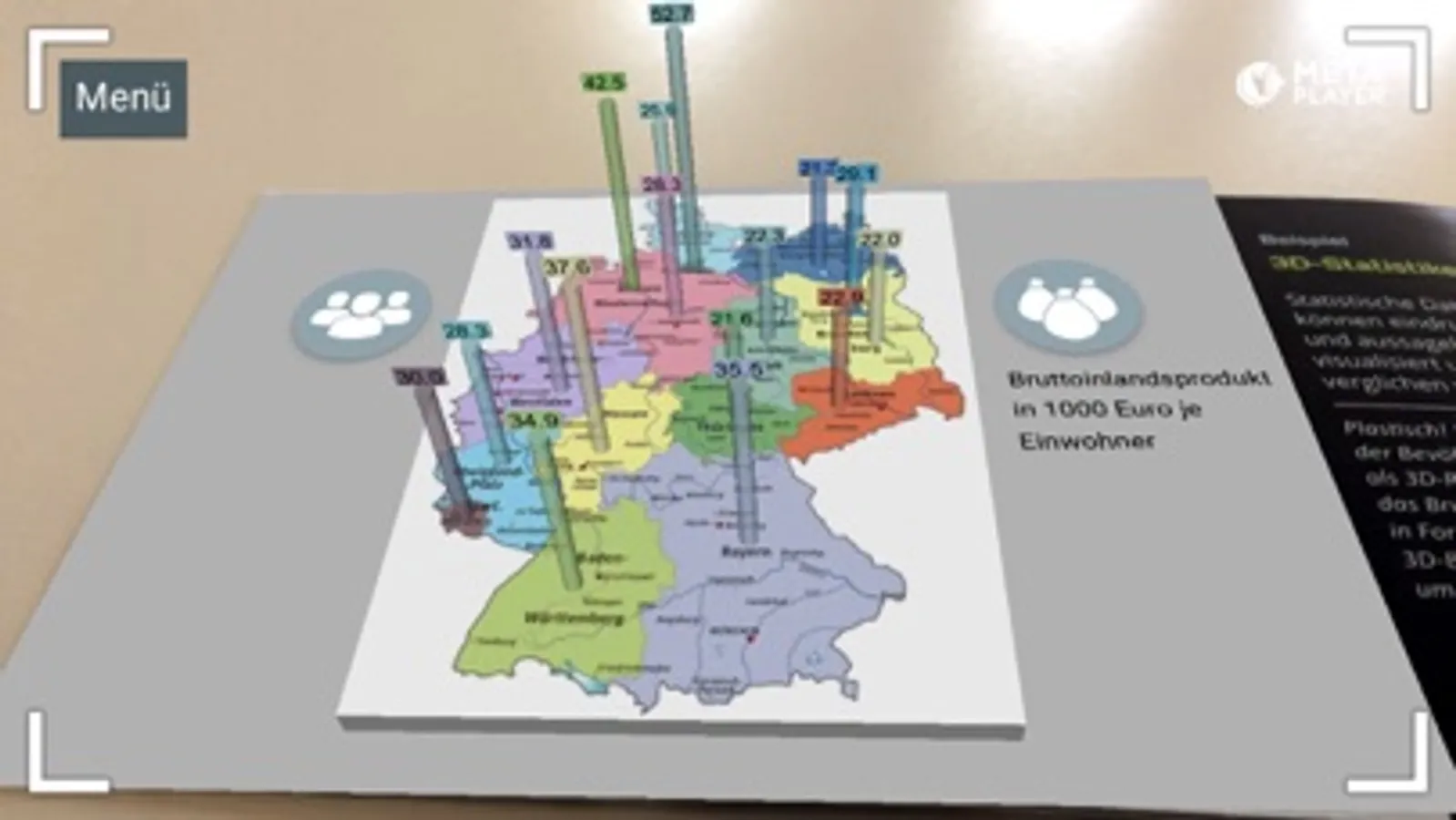 Die App MetaPlayer verbindet mit Hilfe von Augmented-Reality-Technologie die reale mit der digitalen Welt und erweitert so Druckerzeugnisse, Abbildungen, Messewände, Maschinen, Geräte und Exponate etc. mit interaktiven Inhalten.
