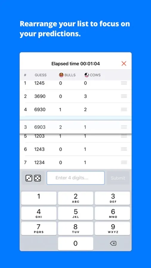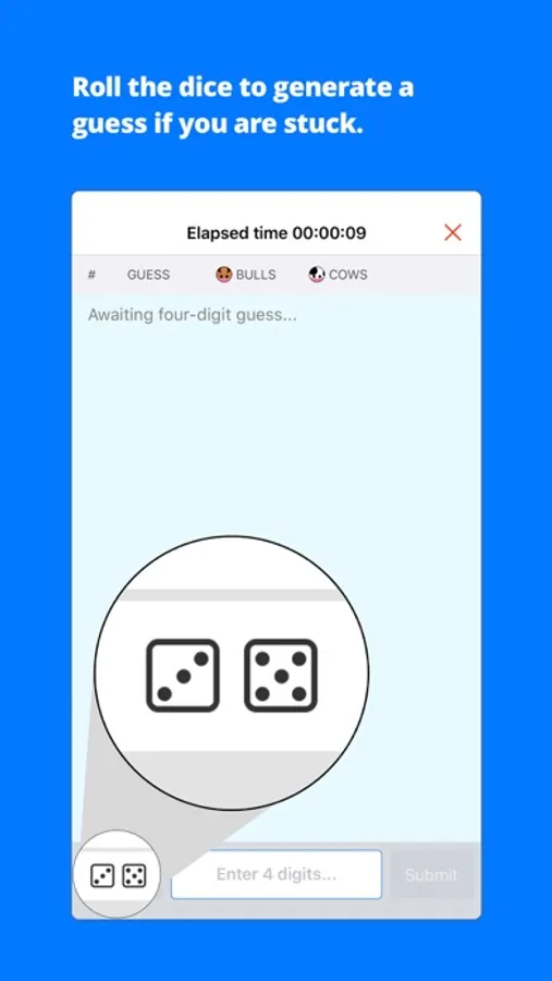 The app generates a secret non-repeating four-digit number that you need to guess in as few turns as possible. Once the game starts the time and the turns you took to guess the number challenges you to be better at prediction.