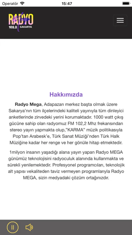Radyo Mega, Adapazarı merkez başta olmak üzere Sakarya’nın tüm ilçelerindeki kaliteli yayınıyla tüm dinleyici anketlerinde zirvedeki yerini korumaktadır. 1000 watt çıkış gücüne sahip olan radyomuz FM 102,2 Mhz frekansından stereo yayın yapmakta olup,”KARMA” müzik politikasıyla Pop’tan Arabesk’e, Türk Sanat Müziği’nden Türk Halk Müziğine kadar her renge ve her gönüle hitap etmektedir.