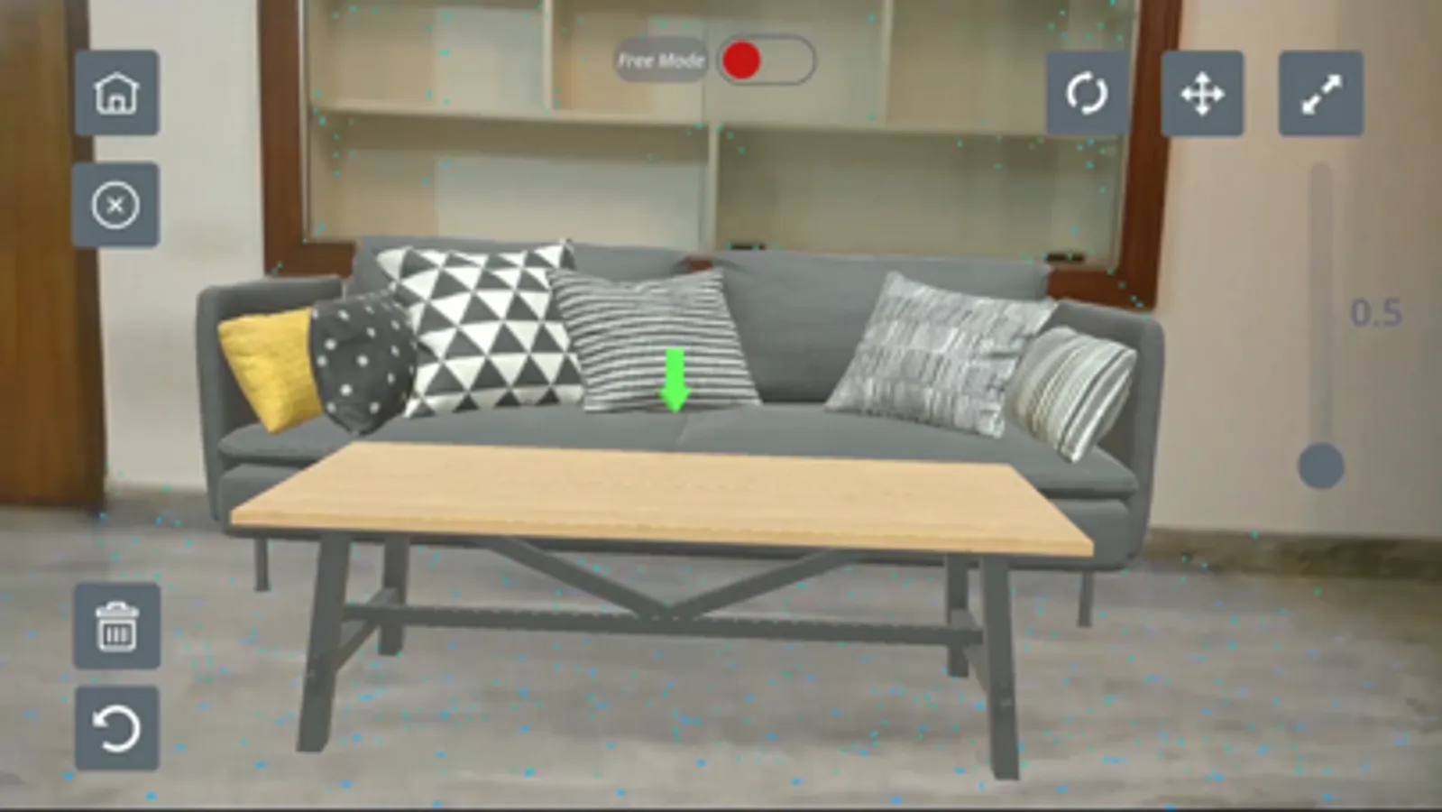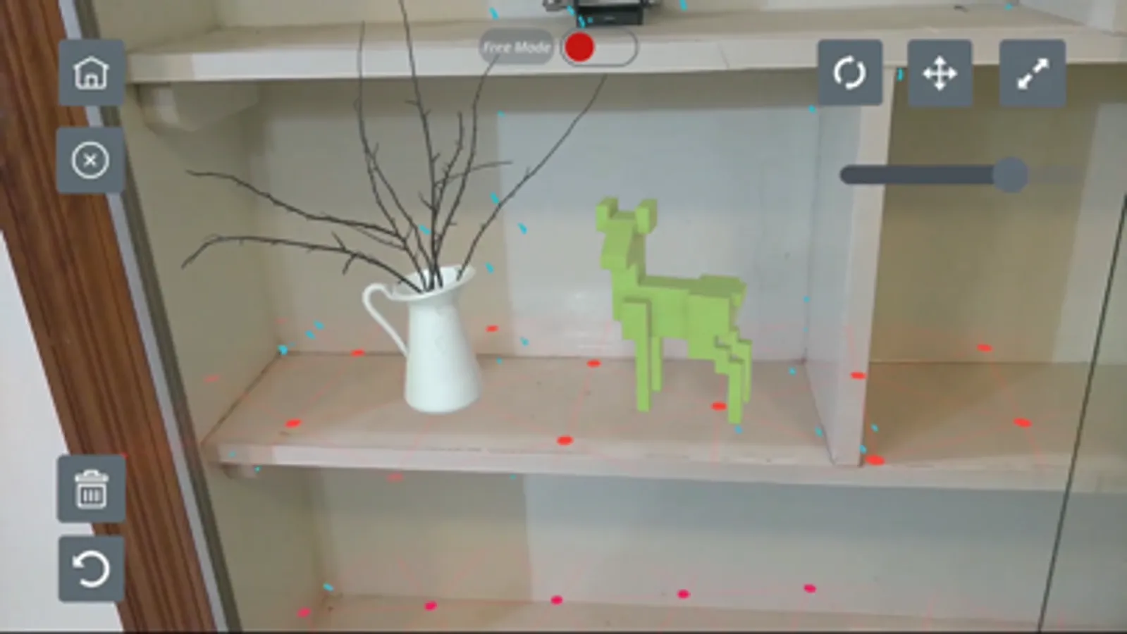 The User friendly UI helps the user identify different options in the application with ease. The “Free Mode “ can be enabled or disabled as per user’s convenience. Free mode gives more screen space to the user. It hides the feature points without disturbing the 3D object’s position so that the user can take a screenshot of the 3D object blend with the real world.