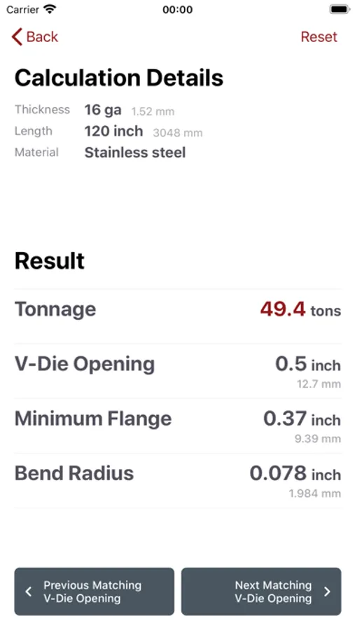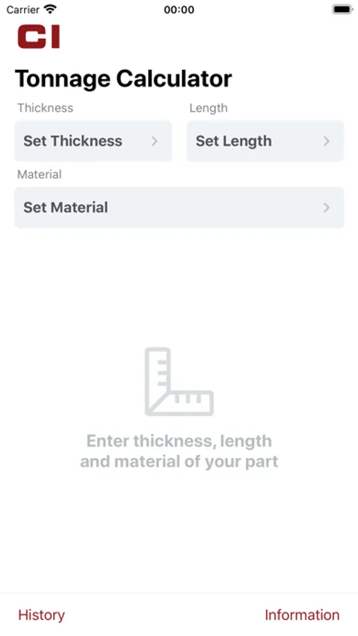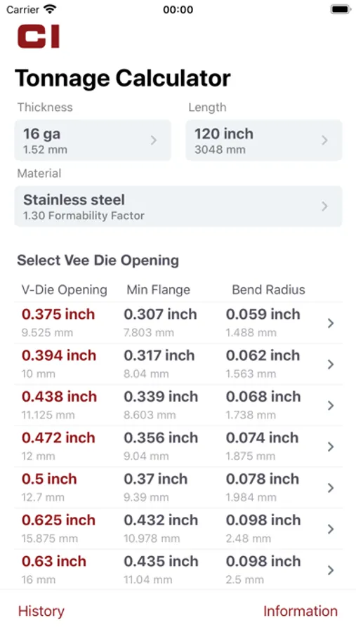 The CINCINNATI Load Calc app is a must tool for any metal fabricator to calculate the air bend tonnage to form a part on a any brand press brake. The intuitive interface will guide the user through the process by allowing selection of material type, material thickness, and vee die opening. From these parameters, a tonnage will be calculated along with the minimum flange length and inside bend radius.
