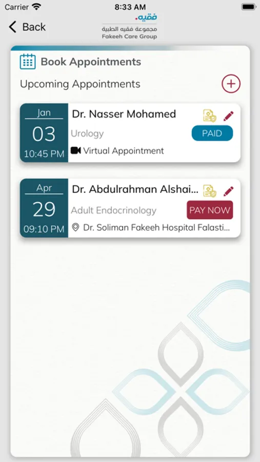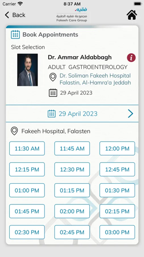 The mobile app will provide flexibility to patient for checking available doctor slot for any specific location for Dr. Soliman Fakeeh Hospital / clinics. They can book an appointment only with the doctor available for respective specialty. They can also view their visits in the app as part of the Timeline feature.
