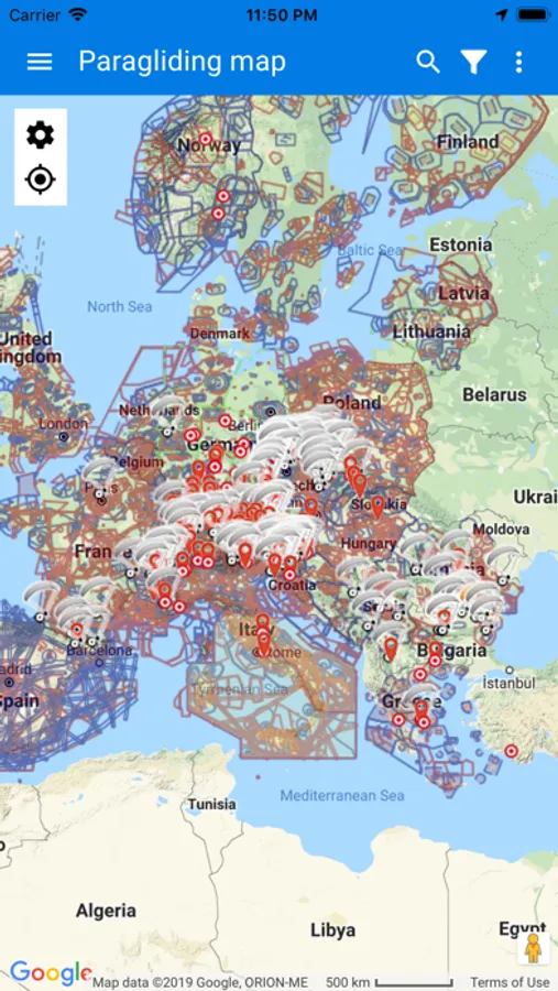 Shows a map of known paragliding sites. Sites that you have already visited are marked as green