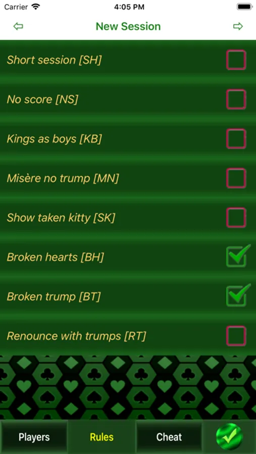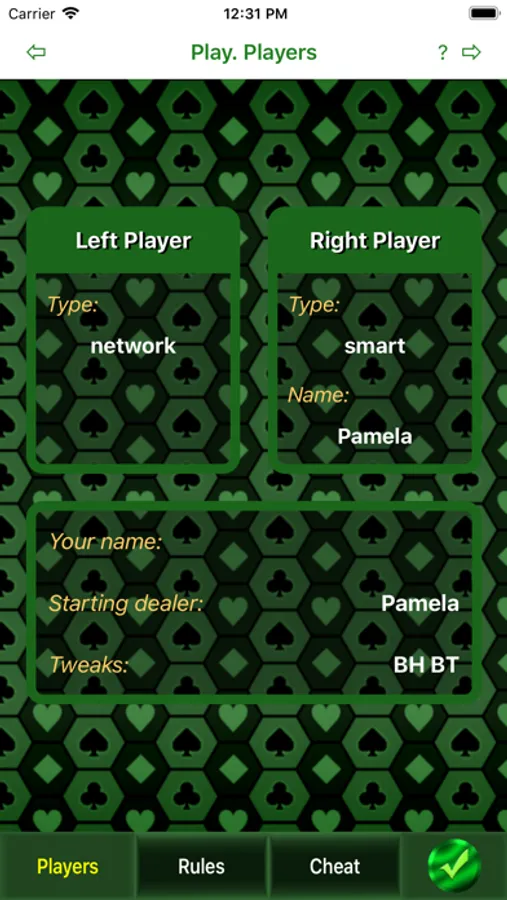 As different flavours of the game exist, the rules can be modified to suit the style of game you are used to. Few cheat options are also supported.