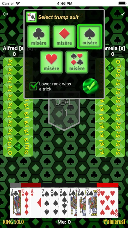 As opposed to traditional King game with predefined order of game types, this is a soloist game (along with Préférence, Solo Whist and Skat) where one player (declarer, contractor, soloist) selects the game specifics and has certain advantage in play, while the others try to prevent the soloist from realising the advantage and improve their own standings at the same time.