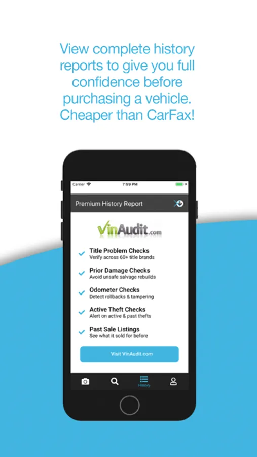 - Full history reports powered by VinAudit and VinCheckup Verify title information, get damage and salvage reports to avoid buying unsafe rebuilds. Odometer checks to detect mileage rollbacks or tampering. Alerts on active and passed thefts or criminal activity. See past sales listings and find out how much the vehicle sold for previously.
