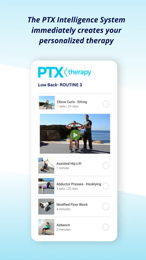 Get completely personalized, science-backed physical therapy routines in the comfort of your home. Tell us about you, and the Patented PTX Intelligence System will immediately give you the right specialized exercises and stretches for your unique situation. Your custom-tailored program adapts weekly as you provide on-going feedback, just like a personal therapist.