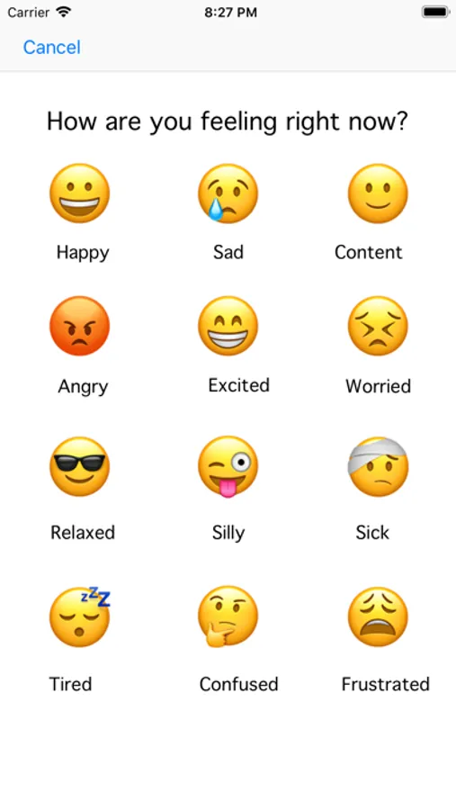 This app helps you track your mood at any point in the day. Select one of the 12 moods from the menu and it will appear in your own personal mood diary. It is designed to help people with mental disabilities better understand their behavior patterns throughout the day.