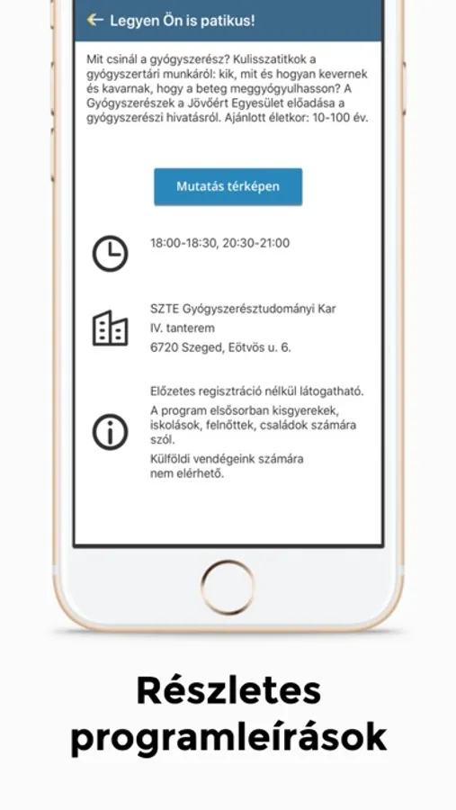 - a térkép funkció a rendezvény helyszíneit jeleníti meg, ahol az egyes helyszínekre bökve megjeleníti az adott címhez tartozó programokat