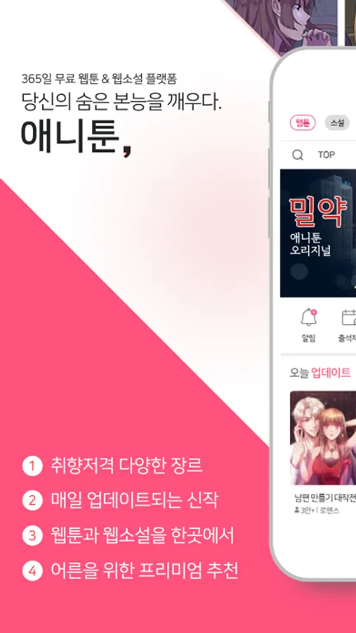 - [천일의 아내], [밀약], [여름의 시작] 등 팬들이 열광하는 독점 웹툰을 정식 연재.