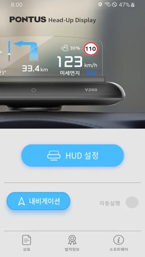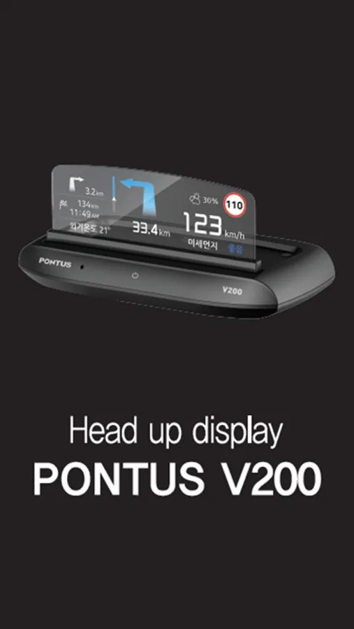 PONTUS HUD V200(Head-up Display)은 Full-Color AM TOLED Display가 탑재된 제품으로 투명 Display에 주행정보 및 날씨정보를 표출합니다. 모바일 내비게이션과 연동하여 실시간 길안내를 (Turn-By-Turn 방식) 제공하며, 날씨정보도 지원 합니다. 디스플레이 자동 밝기 조정, 오토틸트 기능 등 실용성과 편의성을 갖춘 헤드업 디스플레이 제품 입니다.