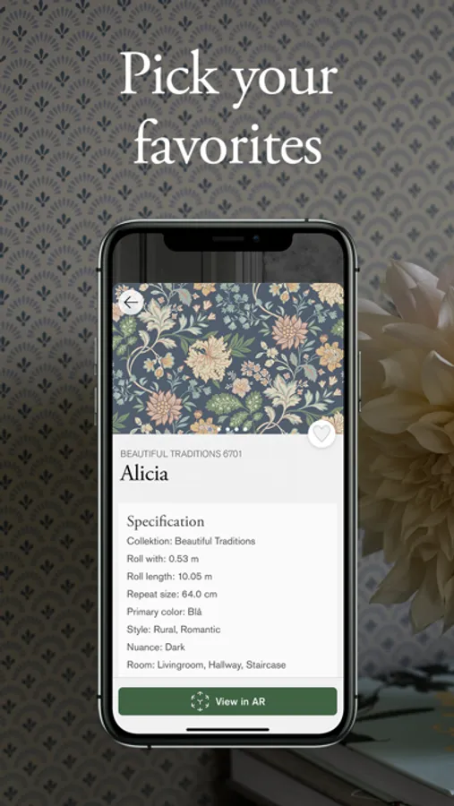 Get inspired using the camera on your mobile phone or tablet. Search the entire assortment, choose a bestseller or choose a new arrival. You can also mark wallpapers you like best as favourites and browse your selection of favourites in real time.