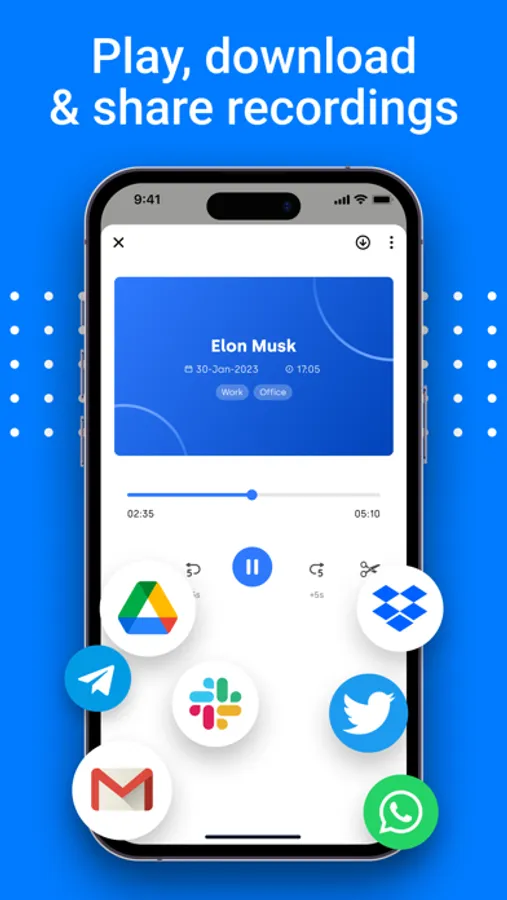 ▶ Share recordings via email, iMessage, Twitter, WhatsApp, Slack, and more.