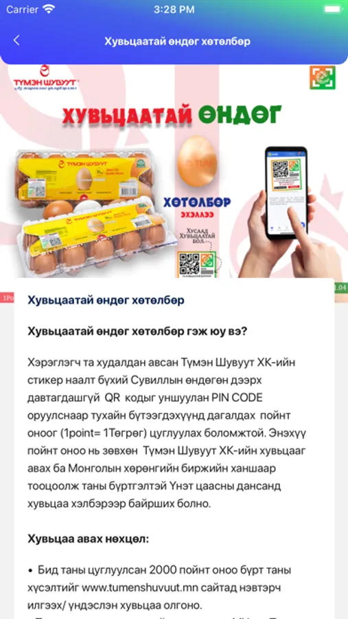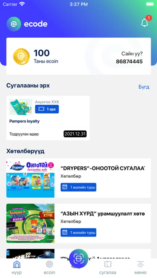 Та хэрэглэсэн бүтээгдэхүүн дээрхи ИКОД-ыг уншуулаад төрөл бүрийн урамшуулал, бэлэг авч, мөнгөн урамшууллаа цуглуулан хонжворт сугалаанд оролцоорой. Ухаалаг хэрэглэгчийн ухаалаг хэрэгсэл Ecode Application.