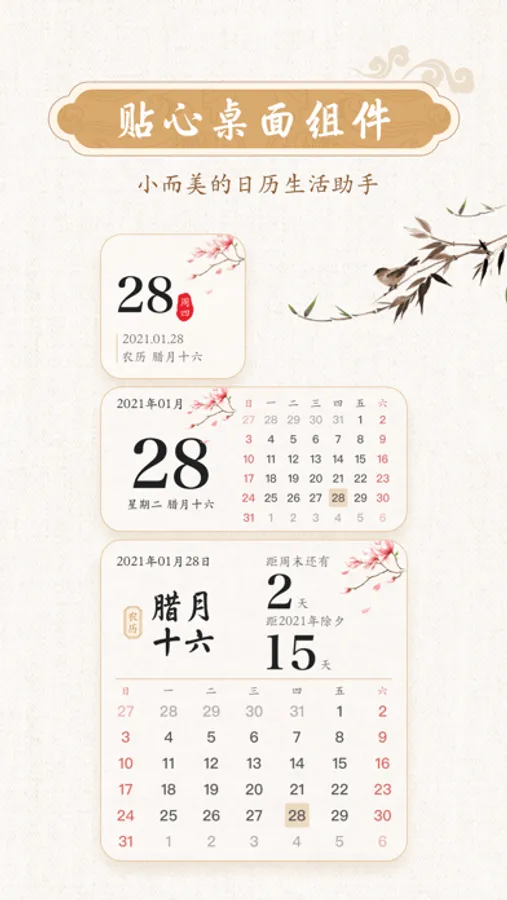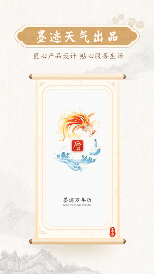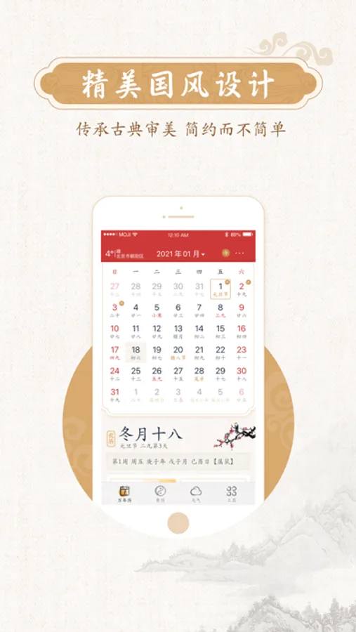中国水墨古风元素,界面元素传承中国传统文化;真实模拟翻页日历动画界面,满足仪式感的同时更有怀旧感