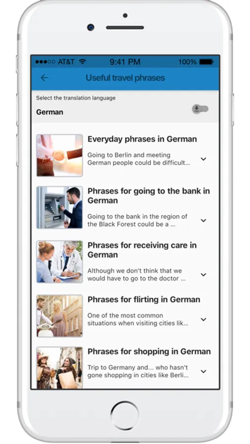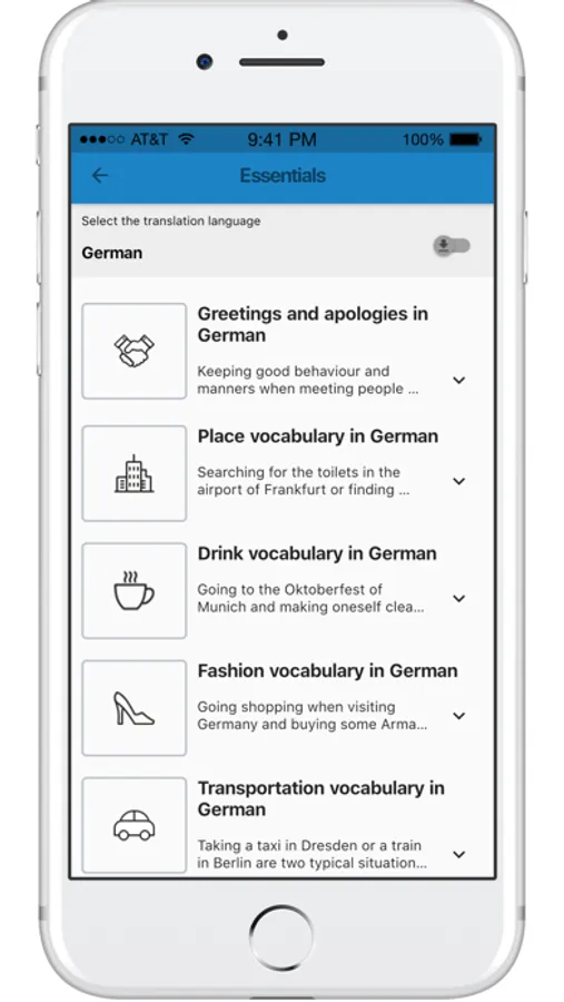 The content is presented in two sections: Essentials and Useful Travel Phrases, each containing different categories relevant for travel. In Essentials there is useful vocabulary for daily situations, while Useful Travel Phrases contains helpful phrases for particular situations.