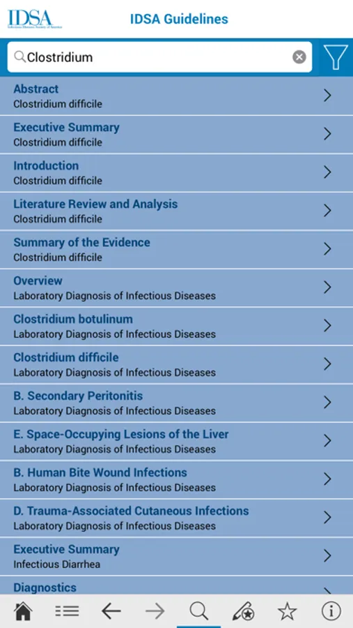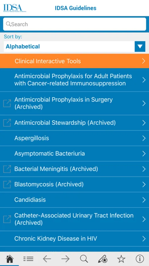Access the Infectious Diseases Society of America (IDSA) guidelines app anytime, anywhere! Download the app today and stay up-to-date on IDSA clinical guidelines, interactive tools, and new resources. The app contains features to search through guidelines, bookmark important pages and take notes on key information. Visit the IDSA app for new guidelines that are released throughout the year and new updates to existing guidelines.
