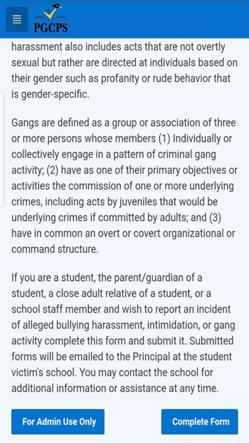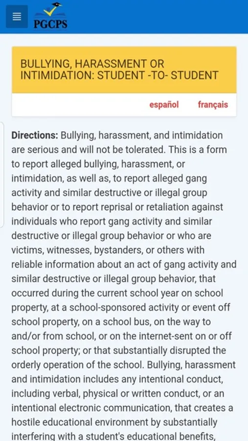 Bullying, harassment and intimidation have no place in Prince George’s County Public Schools. Whether it happens in the hallways or online, such behavior can create hostile learning environments that interfere with students’ academic performance, and emotional and physical well-being. Harassment is motivated by real or perceived characteristics, such as race/ethnicity, gender, religion, sexual orientation, physical or mental ability, or socioeconomic status. Bullying behavior is threatening, intimidating and occurs repeatedly over time with the intent to cause harm. Bullying is unwanted behavior that involves a real or perceived power imbalance. The behavior is repeated over time with the intent to cause harm. Bullying behavior may include: making threats, spreading rumors, attacking someone physically or verbally, and deliberately excluding someone from a group.