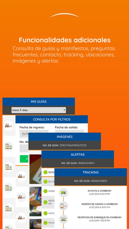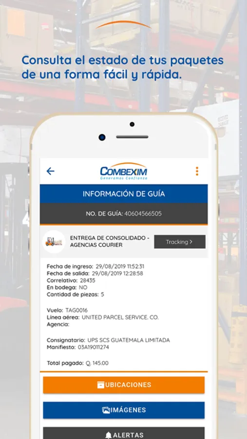 Descarga la nueva aplicación de COMBEX-IM esta te permite hacer seguimiento de tu paquetería mediante número de guía, manifiesto, fecha de ingreso, fecha de salida y palabra clave. También puedes conocer la ubicación exacta de tu paquete, ver imágenes en tiempo real, saber ubicaciones en almacenamiento, alertas, estados de proceso y más.