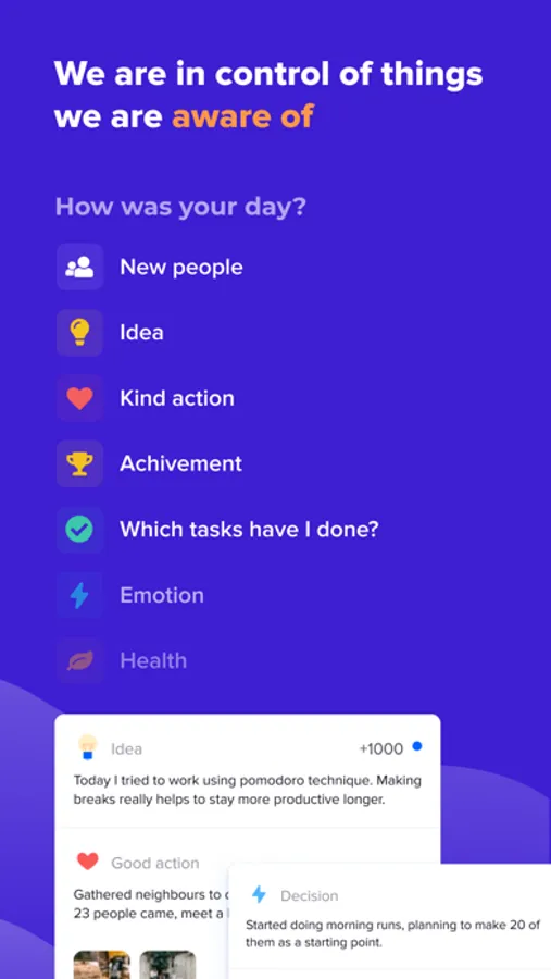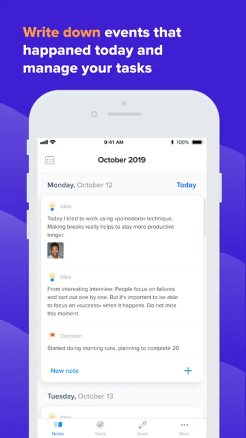 You can also structure your notes using categories (for example, new people, ideas, relationships, people, projects, kind actions, emotions, health, etc.), visualize progress in achieving your goals, receive reports, reminders, and many more. To have a better perception of time, the interface is presented as a calendar.